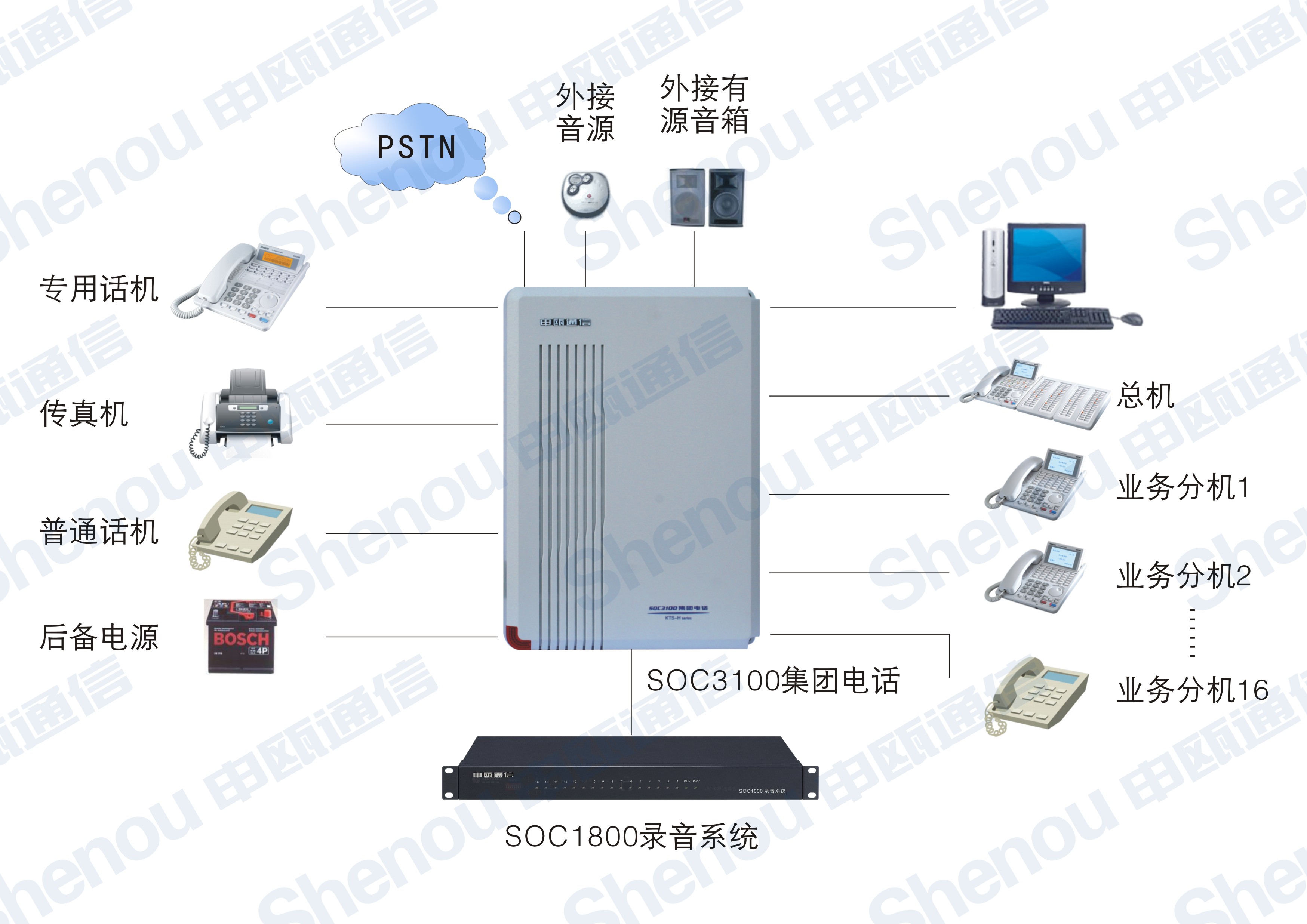 13.配置外置音源接口:用戶可選用電腦音源或其他音源做為集團(tuán)電話的轉(zhuǎn)接背景音樂。
