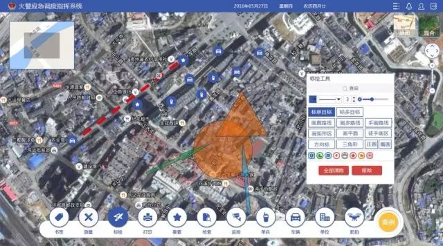 使用業(yè)務(wù)圖標(biāo)庫中的動畫和靜態(tài)業(yè)務(wù)繪制元素在地圖上進(jìn)行標(biāo)繪。如假設(shè)一起火災(zāi)或救援事故,自行在地圖上繪制好處置方式后,從出警至結(jié)束。地圖進(jìn)行動態(tài)演練、全屏播放。
