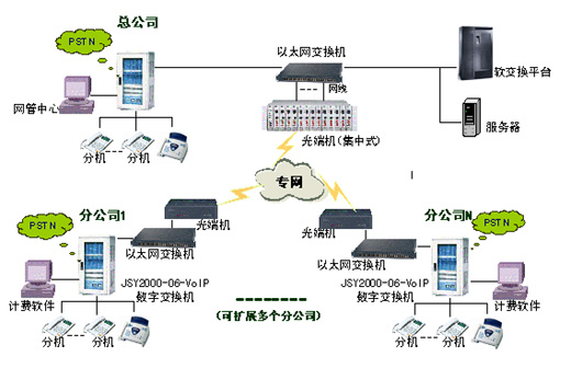 3、對(duì)已加裝數(shù)字交換機(jī)的公司,在保留原有設(shè)備上配置網(wǎng)關(guān),通過(guò)公司的數(shù)據(jù)專網(wǎng)注冊(cè)到總公司的軟交換平臺(tái),平臺(tái)給其分配內(nèi)網(wǎng)的號(hào)碼。這樣,在不淘汰原有設(shè)備的情況下,已有數(shù)字交換機(jī)的部門依然可以與網(wǎng)內(nèi)的其他終端進(jìn)行免費(fèi)通話。